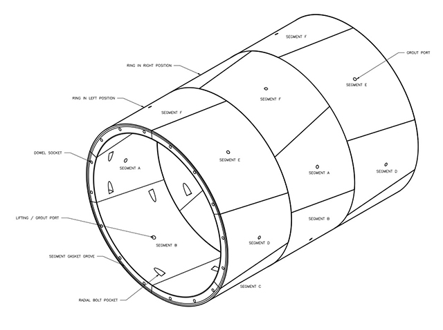 The four foot (1.2 m) wide by nine-inch thick rings are aligned and joined by steel dowels. The six individual segments that form each ring are secured with bolts and made watertight by a unique embedded gasket system. The 6,000 psi high performance concrete used in the tunnel rings are reinforced with high-strength steel fibers—in lieu of steel rebar cages—at a minimum dosage rate of 15 kg of fibers per cubic yard (fig 6).
