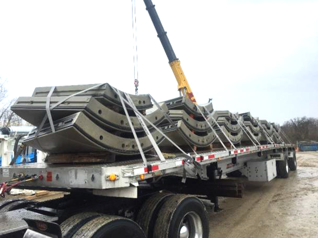 Precaster Technopref Industries, based in Brandywine, Maryland, USA, produced theBCSIS tunnel segments (figs 7 & 8) using its precision batching system, which includes automated systems for dispensing the exact amounts of steel fiber reinforcements andXypex Admix. Segments are cast in molds mounted on rails—know as a carousel—which moves the molds from one task station to the next. Completed tunnel segments were hauled approximately 350 miles from the Technopref plant to the BCSIS job site in Columbus, Ohio (figs 9-11).
