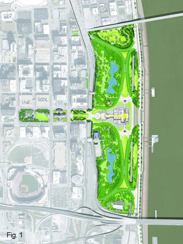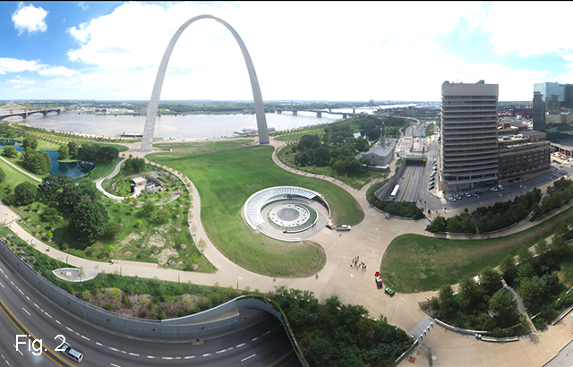 The multi-phase project, which was completed in July 2018, features a 46,000 square foot addition to the preexisting visitor center and museum, the complete renovation of the pre-existing 106,000 square foot Museum ofWestward Expansion, the construction of a 300-foot wide park extension (fig. 2) over an adjacent highway, flood abatement measures, revised landscaping for the 91-acre park, and the renovation of two major plazas that lead west from the park into downtown St. Louis.