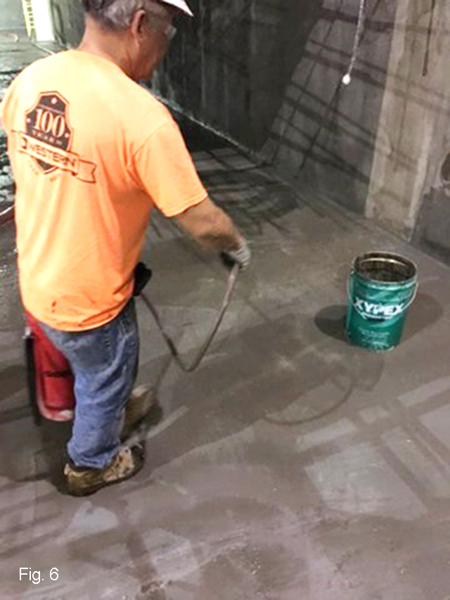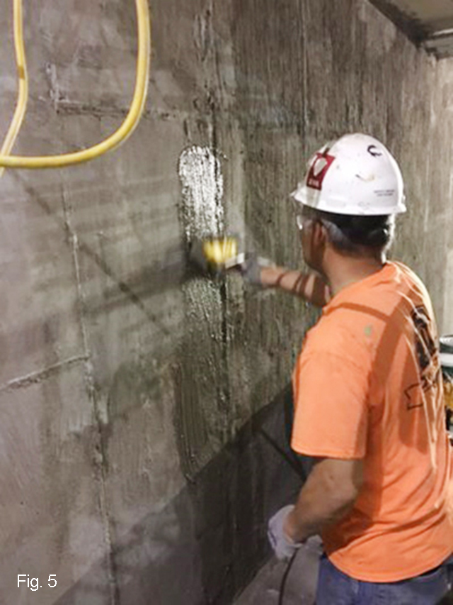 WSC worked in small crews to apply the Xypex waterproofing products (fig. 5 & 6) to nearly 20,000 square feet of interior tunnel surfaces. “Other contractors needed access to the tunnels so we had to kind of work around some of the other trades,” Belgeri says. “We wouldapply the Xypex for three or four days andthen take a short break while other workersfinished their jobs. Working in that way, it took about a month to do the whole thing.”
