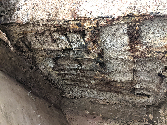 The city completed the headworks facility in 2010 (fig 4) to replace a preexisting lift station that had reached the end of its useful life. Unfortunately, the new headworks facility has experienced accelerated corrosion due to high levels of hydrogen sulfide (H2S) gas emitted from the slow moving sewage stream.Hydrogen sulfide gas is formed through the microbial breakdown of organic material in the absence of oxygen, known as anaerobic digestion. A complex bacterial process—known as microbial induced corrosion of concrete (MICC; sometimes shortened to MIC)—ultimately produces biogenic sulfuric acid that can steadily reduce the surface pH of concrete sewer system components to destructively low levels leading to rapid decay of the concrete elements themselves.