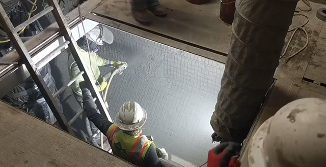 The wet well is located nearly 30 feet (9.1 m) below grade and subject to constant hydrostatic pressure from ground water. As a cementitious product, Xypex Megamix II with Bio-San provides excellent adhesion to moist concrete surfaces. “When you have backside water pressure, it can be a struggle to getthe surface dry enough for epoxy or other coatings,” Teunissen notes. “Megamix with Bio-San actually requires a moist surface to work, which is a big advantage. And, it seals the leaks that may be causing the wetness.”