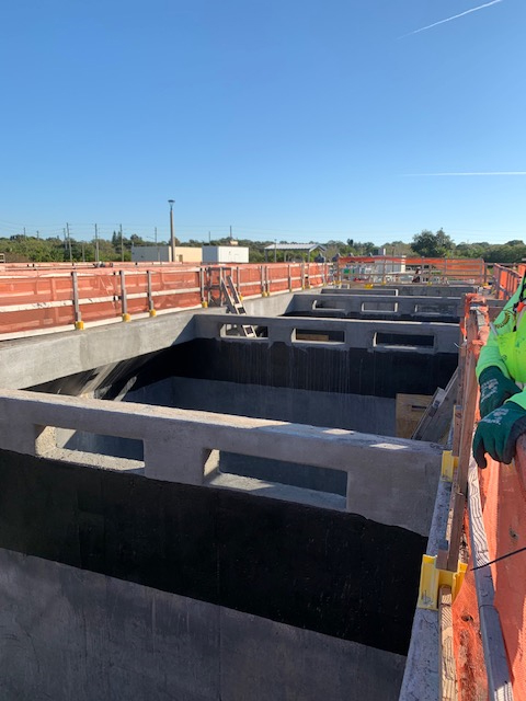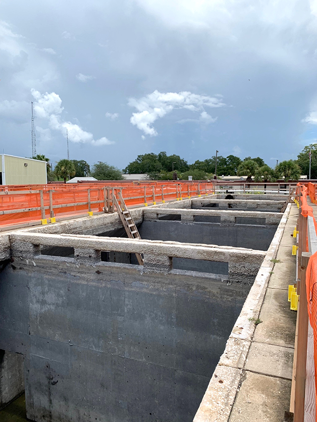 Exceletech Coatings and Applications of Clermont, Florida, was selected to repair the Largo WWTP BNR infrastructure. The firm prepared the concrete tanks by pressure washing the damaged walls to remove loose concrete and other debris.