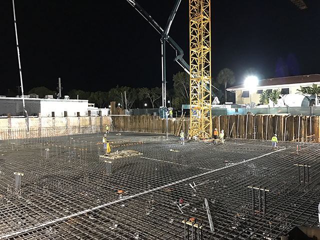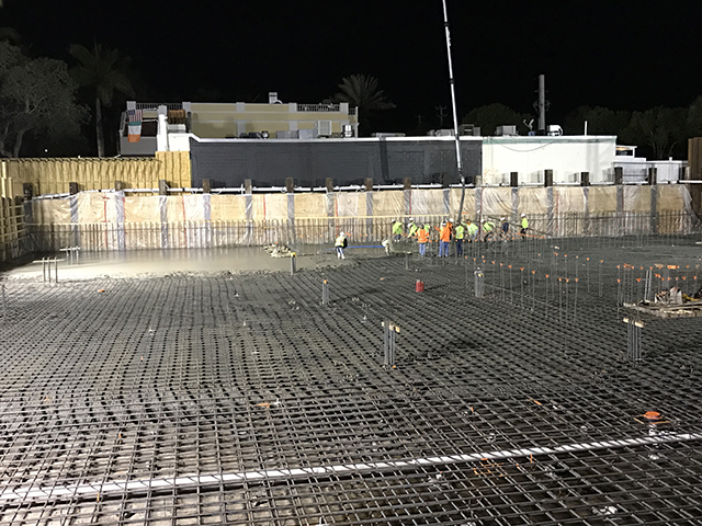 Xypex Admix C-1000 NF admixutre was used in this one-storey below-grade foundation, slab and walls, to waterproof 1,500 cubic yards of this concrete structure. This project is located three city blocks from the Gulf of Mexico and if subject to extreme hydrostatic pressure. This one storey below-grade foundation will be utilized as a parking garage. Above the garage will be 51 hotel units, 62 multifamily residential units, including a restaurant and swimming pool. The concrete placement was competed at night due to the high commercial and residential traffic.