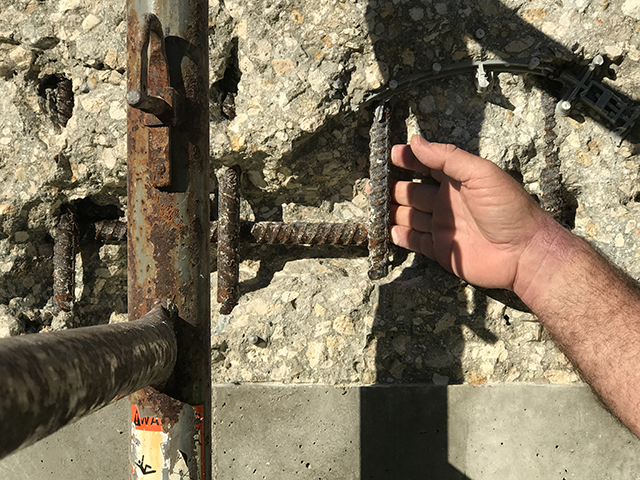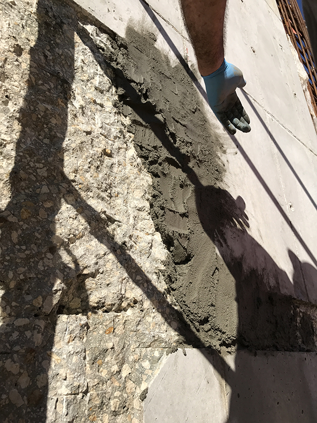 Xypex Southeast Regional Manager Paul Derby, with Florida Xypex rep. Christy Krone, provided to the contractor a tutorial on the best method of repair using Megamix II. Scrub-coat performed first is essential in all areas to provide adhesion of Megamix II in various depths, as needed. Providing a hand-width clearance behind the rebar is necessary when filling voids properly, with the addition of crosshatching the surface for adhesion when multiple lifts are needed to fill voids.
