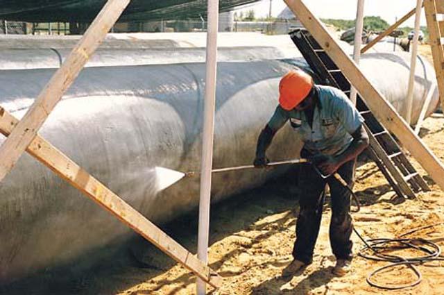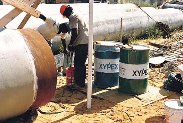 The underground piping for this pollution control facility consists of steel pipe sections which are coated with a thin layer of cement mortar. This mortar layer was very porous and was spalled in some areas. Therefore, if left untreated, the steel would be exposed to ground water and subsequent oxidation. After repairing the spalled areas, exterior surfaces of all pipes were treated with a two-coat application of Xypex Concentrate and Modified. The Xypex treatment prevented corrosion to the steel core of the piping.