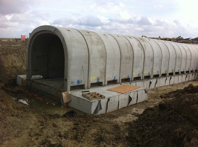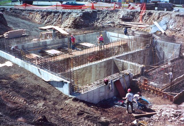 Below-grade mat slab and pre-cast tunnel sections used in the storage of iron ore pellets.